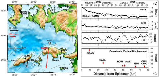 (a) Map showing the focal mechanism of the earthquake together with the co-seismic horizontal displacement vectors of seven GNSS stations located near the epicenter (station SAMO’s vector is at a different scale compared to the others). (b) Diagram showing the co-seismic vertical displacements (and error estimates) as a function of distance from the epicenter. (c) Time series of the daily coordinates of station SAMO for the period following the earthquake (2 November 2020 to 28 February 2021).