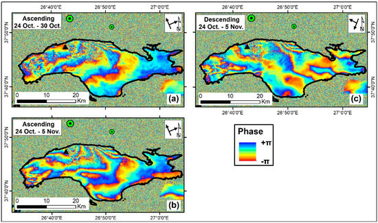 Wrapped phase InSAR maps derived from the Sentinel 1 satellites on (a,b) ascending and (c) descending orbital trajectory. Color scale (−π to π) describes one cycle of phase difference between the reference and repeat SAR images in the line-of-sight direction (LOS), which represents 28 mm of ground displacement along this direction. Black triangles mark the two GNSS stations on Samos (SAMO to the west and SAMU to the east). Green polygons mark the earthquake and the strongest aftershock. Inset arrows indicate the heading azimuth and look direction of the radar satellites.