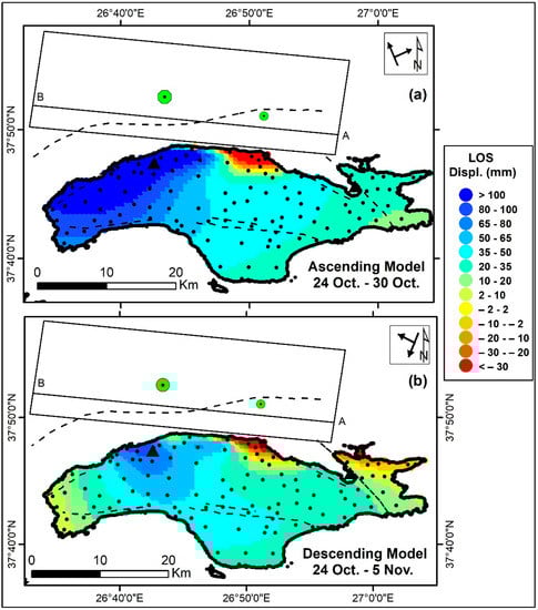 For direct comparison to InSAR results, the 3D modelled vector was computed on a grid of 500 m × 500 m that covered Samos. This vector was projected on the LOS direction for the ascending and descending acquired pairs by using the geometric characteristics for each track at time of acquisition (Figure 10).