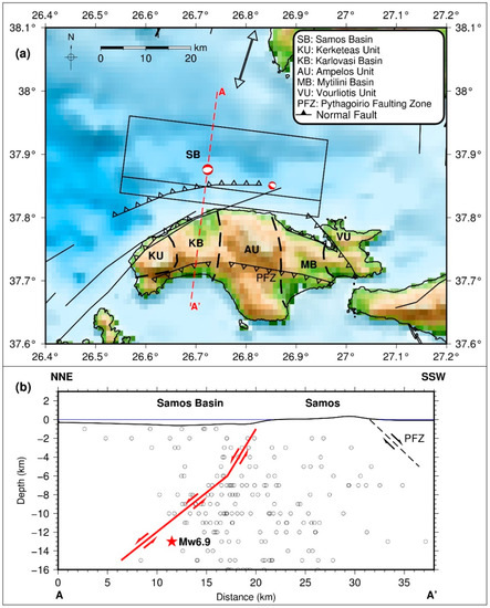 - Papadimitriou, P.; Kapetanidis, V.; Karakonstantis, A.; Spingos, I.; Kassaras, I.; Sakkas, V.; Kouskouna, V.; Karatzetzou, A.; Pavlou, K.; Kaviris, G.; et al. First Results on the Mw = 6.9 Samos Earthquake of 30 October 2020. Bull. Geol. Soc. Greece 2020, 56, 251–279. [Google Scholar] [CrossRef]