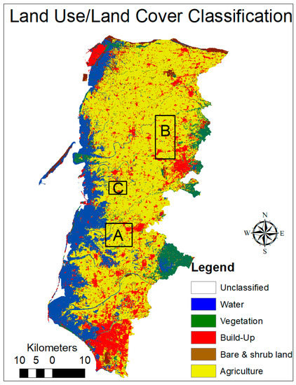 LULC of Yun-Chia-Nan Plain was aggregated into five major types, including built-up, vegetation, bare soil, water, and agriculture. Characteristics of LULC have been clearly shown in Figure 2. The visual interpretation shows that classification result is basically consistent with land surface features extracted from high spatial resolution image interpretation and information from field observations. Time-series data showed an additional source of information to identify land use types. This advantage is used to recognize the spectral signatures in accordance with the change in the surface canopy, which is not detectable in a single-date data. For instance, by using single-date data, the cultivated areas could be misidentified as built-up/dryland or water body in the land preparation stage and planting or after harvesting stage, respectively. Results indicated that the cropland dominates land cover, covering 59.86% of total area. Cropland consists of paddy field, dry land farming, and other agriculture purposes. Water bodies (lake, river, and aquaculture systems), mostly located along coast, are the second dominant land cover of this region, comprising approximately 16.62% of the land. Built-up, bare soil, and forest occupy 14.7%, 5.89%, and 2.92% of the land area, respectively. In order to make a quantitative analysis of land cover classification results, Google Earth Pro and expert knowledge of authors were used to understand the land surface characteristics as reference data for validation based on an independent set of training points randomly chosen from different sub-areas of the entire study area. Results show that time-series of Landsat 8 OLI can capture surface characteristics over different periods for LULC classification with overall accuracy of 88.6% and Kappa statistics of 0.83.