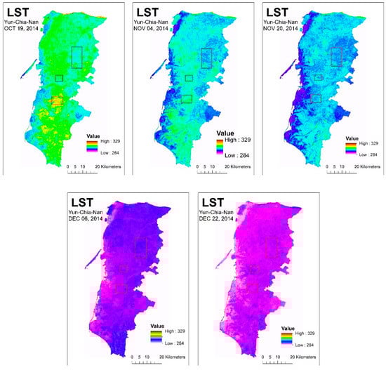 Time series variation of LST over Yun-Chia-Nan Plain was retrieved from Landsat 8 OLI/TIRS data. Figure 3 shows the spatial distribution of LST over five time-points, which were conducted during 2014 winter growing season. Results indicated that average LSTs are decreased over time across the study area as evidenced from its trend at 307.75 °K, 303.28 °K, 301.4 °K, 294.35 °K, and 292.06 °K corresponding to 19 October, 4 November, 20 November, 6 December, and 22 December, respectively. LST values were then evaluated by the near-surface air temperature measured by CWB meteorological stations at 2-m height (Tair). Although there exist different physical meanings, the significant relationship between LST and Tair has been reported in the literature [38,39]. Results indicated that the LST values are sufficiently accurate for further applications. LST and Tair presented the strong correlation r2 of 0.94 with RMSD of 5.13 Kelvins in the difference between LST and Tair. The previous studies indicated that the difference between LST and Tair can reach 20 (Kelvins) at noon under an extremely hot day [40].