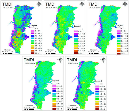 Temperature-soil Moisture Dryness Index (TMDI) over Yun-Chia-Nan on 19 October, 4 November, 20 November, 6 December, and 22 December 2014.