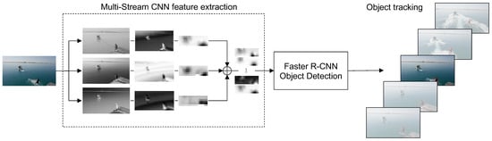 Overview of the proposed object tracking pipeline. Frames from a video sequence are resized to maintain the original aspect ratio. The proposed Multi-Stream CNN analyzes the image through three separate streams, producing feature maps on different details. The maps are then used by the Faster R-CNN object detector, while tracking is finally achieved through the Deep SORT algorithm.