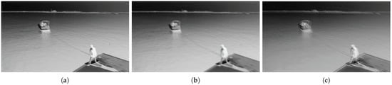 Filter examples derived from different streams of the proposed pipeline. Kernels of size , , and , applied to the same image, are shown in (a–c), respectively.
