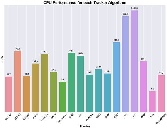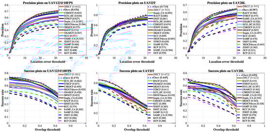 The proposed method is compared with 16 state-of-the-art deep-based trackers. These trackers are, namely, DSARCF [52], ECO-HC [53], CSRDCF [54], STRCF [54], Staple_CA [55], SRDCF [56], SRDCFdecon [57], BACF [58], KCC [59], SAMF_CA [55], fDSST [60], SAMF [61], DSST [62], KCF [63], DCF [63], and DRCF [64]. As mentioned in Section 4.2, the trackers are evaluated with the AUC on the Success Plot and the CLE for the Precision plot. For the latter, the common 20 pixels threshold is used.
