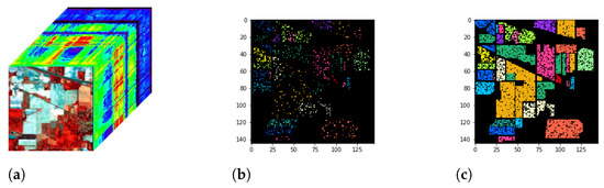 (a) The HSI data cube of Indian Pines dataset [21], (b,c) illustrate the training set and the testing set under the random sampling strategy in HSI classification. The colored points represent the selected pixels. The training set consists of samples randomly selected with a fixed number in each categories, and the remaining samples form the testing set.
