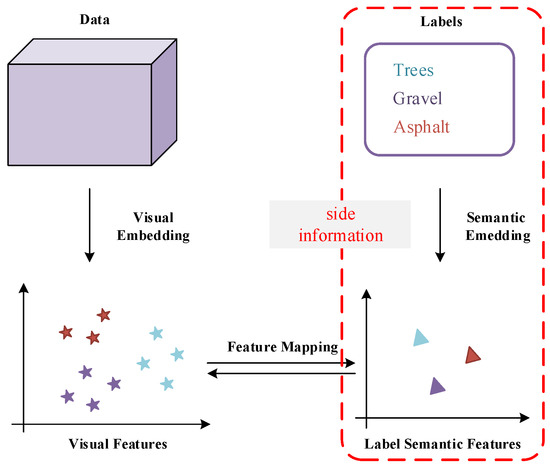 Usually, the hyperspectral features and the label semantic features are in different embedding space, so the core stage is to find their correspondence by feature mapping. According to the choice of the embedding spaces, as Figure 6, it can be split into two cases: the visual-semantic mapping or the semantic-visual mapping.