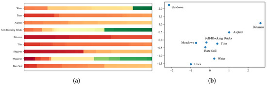 Generally, the goal of constructing a word embedding space is to capture some sort of relationship in that space, be it semantic, morphology, context, or some other kind of relationship. Figure 3a shows the label semantic distributions of the Pavia Center dataset. Typically, words with similar meanings will have vector representations that are close together in the embedding space. Figure 3b presents the distance between different labels by the PCA two-dimensional projection.