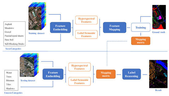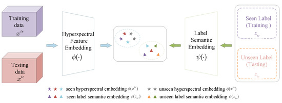 Then, we construct hyperspectral feature paired with label semantic feature on the training set through their label to learn the mapping between them. Finally, the learned mapping is applied to the testing data to get the corresponding embedding, and the final label is derived by similarity measurement.