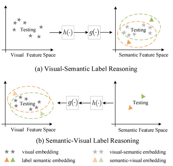 As shown in Figure 2, the solution for zero-shot learning is to firstly employ side information, i.e., label semantic embeddings from external knowledge sources, to narrow the gap between the seen and unseen categories. Label semantic representations such as attributes and word vectors are common choices in zero-shot learning, both of them are high-level descriptions of the label [30,33,34]. The association between seen and unseen categories is established in the label semantic feature space. Then, the correspondence between semantic features and visual features is learned through feature mapping. Hence, such a correspondence can be transferred from seen categories to unseen categories.