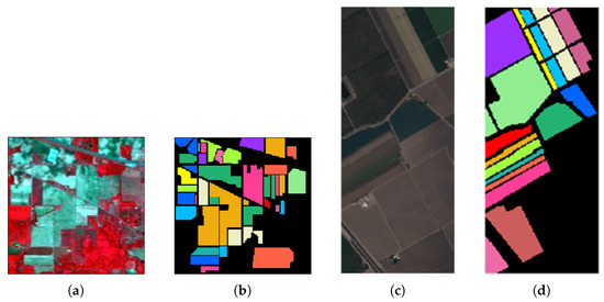 (a) The false color image of the Indian Pines dataset [57], (b) The corresponding ground-truth map. (c) The false color image of the Salinas dataset [22], (d) The corresponding ground-truth map.