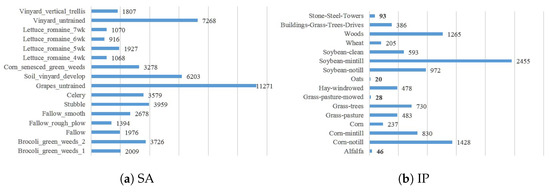 We complete a set of experiments on a pair of datasets collected by the same hyperspectral sensor. The reason for this selection is that different hyperspectral sensors have significant spectral gaps in hyperspectral imaging due to differences in wavelength range and spectral resolution. Our choice of pair datasets acquired by the same hyperspectral sensor can maintain greater consistency in the physical meaning of the spectra. So, we select four public hyperspectral datasets, including Indian Pines (IP), Salinas (SA), Pavia Center (PC), and Pavia University (PU). The false color images and the corresponding groundtruth maps are shown in Figure 8 and Figure 9, respectively. According to the hyperspectral sensor type of collecting data, we divide them into two groups, A and B. Each group has two datasets to form a pair of training set and testing set. Table 1 shows the detailed information of these four datasets. In addition, the name of categories and the corresponding number of samples of these two groups are shown in Figure 10 and Figure 11, separately.