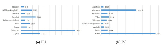 Case 5 and case 6 where the training set and the testing set shared some categories are attempts for generalized zero-shot learning. Table 7 shows the experimental results. Compared with previous experiments, the top-k accuracy has no significant improvement with the existence of common categories. There are two main reasons. First of all, both datasets have 9 categories, but their distribution of each category is visibly different, even the same categories in PC or PU has a significant difference in distribution. For example, the entire PC dataset contains 148,152 labeled samples and the PU dataset contains 42,776 labeled samples in total. What’s more, as shown in Figure 11, “Meadows” has 18,649 labeled samples in the PU dataset but has 42,826 in the PC dataset.“Self-Blocking Bricks” is the category with the fewest samples in the PC dataset, and there are only 2685 samples, but it ranks fifth in the number of samples in the PU dataset, with 3682 samples. Secondly, it is worth mentioning that the spectra of the same land-cover may not be fully consistent. The spectral curves of the same type of land-cover in the same dataset may have a certain range of fluctuation due to the spatial distribution or occlusion. Moreover, for these two datasets collected by the same sensor, the differences in the imaging environment, such as different weather conditions or lighting effects, may cause some variations in the spectrum of the same category. These also have a certain interference on the performance of classification. Besides, the experimental result of case 5 and case 6 are also consistent with the trends of the previous experiments.