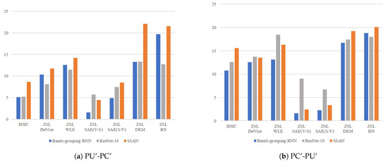 Focusing on case 3 and case 4 of Group B (see Table 6), it can be noticed that only the results of the WLE and RN perform beyond the random classification performance in the PU-PC case. This is in stark contrast to the results of another case PC-PU, in which all zero-shot learning methods perform better. The huge difference between the number of labeled samples for training and testing comes to the first reason for this situation. It can be seen in Table 3, the PC dataset has 91,775 labeled samples while the PU dataset only has 36,817 in case 3 and case 4. The second reason is the unbalanced categories. Both of them have severely uneven data distribution. For example, the number of “Waters” in the PC dataset is 65,571 and “Meadows” has 18,449 samples in PU dataset while the other categories only have a few thousand. Group A has a similar situation. Besides, Group B covers the scene captured from the urban area, where most of the categories have a scattered and complex spatial distribution.