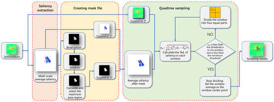 (3) Quadtree sampling based on saliency: The average saliency graph after masking the largest area can preserve the details of the main deformation in the quadtree meshing, so the far-field can be uniformly sampled with the maximum window size. QS takes the standard deviation of the deformation in the window as the reference index. However, SQS uses the standard deviation of saliency () in the window as a reference index. When is greater than the set threshold, the window is equally divided into four windows. Perform iteration until in the partitioned window is smaller than the threshold or the window size is smaller than the minimum size. According to the principle of the quadtree algorithm, the image needs to be cropped or expanded into a matrix with both the length and width of 2n pixels (n = 0, 1, 2…) before sampling.