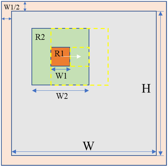 For extracting saliency by the multi-scale filtering method, we set the sizes of the sliding window () and search window () as and , respectively. Then the absolute value of the difference between the average of the sliding window and the search window was calculated. is assigned to all points in the sliding window . Moving the two windows in the whole image, we obtained the saliency, of the image (1 ≤ ≤ , is the length of sequence). Changing the size of , we got the average saliency of the image by . See Figure 2 and the following for details.