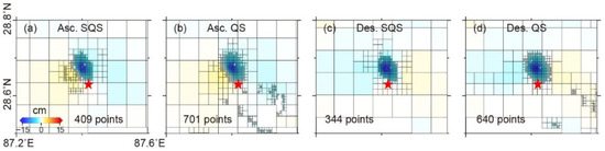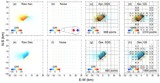 We used both SQS and QS to sample the simulated deformation fields. For SQS, the deformation is normalized to 0~1, and saliency is calculated with of [4 6 8 12 16 24] and of 140. The threshold is 0.08 and 0.1 for ascending and descending images, respectively, when the saliency is binarized. After one expansion, the mask file is generated (Supplementary Materials Figures S1 and S2). Based on the saliency figure and the mask file, we use the minimum and maximum divided windows of 2 and 64, and the threshold of 0.03 to divide the grid. The results of SQS are shown in Figure 4c,g. QS adopts the same maximum and minimum divided windows and uses the threshold of grid partition as 0.5 cm (Table 2). The QS results are shown in Figure 4d,h. SQS effectively reduces the noise in the far-field deformation and retains the details of the near-field deformation. To test whether SQS can distinguish the near-field from the far-field under the condition that the noise level is equal to the deformation level, we tried to increase the magnitude of the noise (±29 cm) to make it larger than the maximum of the main deformation (see Supplementary Materials Figure S3). The results show that SQS can still distinguish the near-field from the far-field and reduce the interference of local deformations.