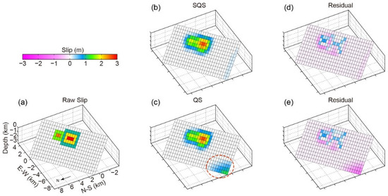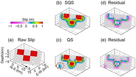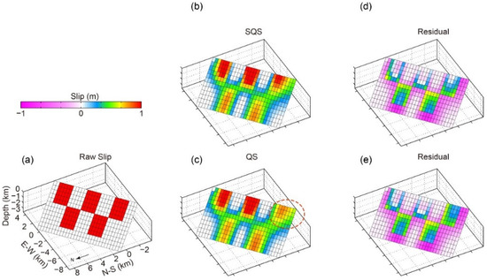 The linear inversion results obtained using the SQS and QS sampling points. (a) Input slips. (b,c) Inverted slip based on SQS and QS. (d,e) Residuals between the inverted and input slips. The geometry of fault is based on the parameters of SE 2 in Table 1.