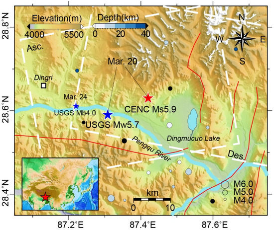 The Rikaze region of China is located on the border between China and Nepal in the northern foothills of the Himalayas. The Rikaze region between the normal fault system of North Himalayan and the Yarlung-Zangbo River fault system [21]. Due to the East–West tension, the normal rift faults of Shenzha-Dingjie and the Dangreyongcuo-Dingri fault are formed in this area [22,23]. Since 1950, 15 M > 5 earthquakes have occurred in the vicinity of Dingri County, Rikaze, the largest of which was M6.2 on 20 March 1993 (United States Geological Survey, USGS, https://www.usgs.gov/natural-hazards/earthquake-hazards/earthquakes, last accessed 4 April 2021). On 20 March 2020, an Ms5.9 earthquake occurred in Dingri, Rikaze (China Earthquake Networks Center, CENC, https://www.cenc.ac.cn/, last accessed 4 April 2021), which was called the Dingri event (Figure 8). As the earthquake area was sparsely populated, the event caused no human or serious property damage. However, since the earthquake occurred on the plate boundary and to the north of the 2015 Nepal Mw 7.8 earthquake [24,25], the Dingri earthquake provides valuable information on plate movement and tectonic characteristics.