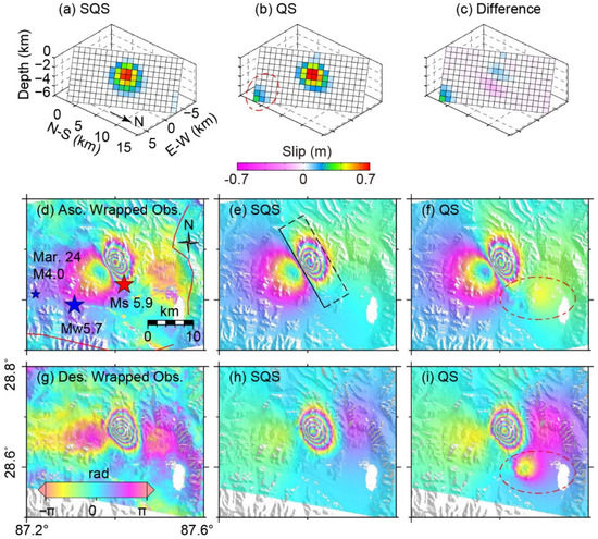 Using these two slip models we forwarded and wrapped the surface deformation by 2.8 cm per fringe (Figure 10). The red ellipse region in Figure 10f,i is caused by the unreliable asperity in Figure 10b. The checkboard test also shows an abnormal asperity in the inversion result based on QS (Figure 11c), indicating that the inversion results of QS are influenced by the local deformation in the south of the fault. In Figure 10, the forwarded deformation based on SQS points is more consistent with the original deformation field, and the local signals around the lake are ignored. The forwarded descending deformations in the center and the west part of the epicenter (Figure 10h) are slightly lower than the observations, because an M4.0 aftershock occurred 4 days after the mainshock. The ascending secondary image was imaged about just 11 h after the mainshock, so it does not include the aftershock, but the descending secondary image acquired on April 1 includes the deformation of this aftershock. Thus, the overall descending observation is slightly larger than the forwarded result. We obtained the deformation of the M4.0 aftershock using the Sentinel-1 ascending image (Supplementary Materials Figure S5) and confirmed the above analysis. Furthermore we found that the main deformation location of the aftershock is on the northeast of the epicenter provided by USGS (the small blue star in Figure 8), close to the mainshock (the red star in Figure 8), which reflects the advantages of InSAR in earthquake observation and epicenter determination.