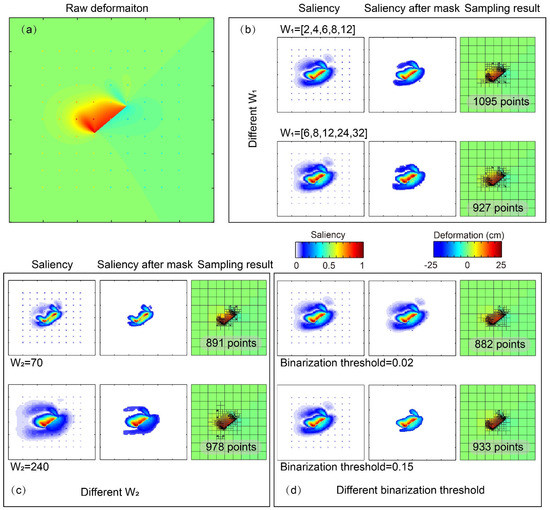 The parameters setting is also an important factor affecting the results of SQS. Moreover, and the maximum and minimum segmentation windows are set according to the demand. If more points and more detailed information are needed to be displayed, the and maximum and minimum segmentation windows can be reduced, and vice versa. , , and the binarization threshold affect the segmentation of near-field and far-field. The smaller the or the longer the sequence is, the more detailed the saliency is. can affect the overall shape of the saliency figure. Generally, the larger the is, the larger the near-field range is. Figure 12 shows how the results change when these parameters change independently. The raw deformation in Figure 12 is same as Figure 4a. SQS parameters used in Figure 12b–d are consistent with SE 1 Ascending in Table 2, except for the parameters indicating the changes. For the results in Figure 12, SQS can separate near-field deformation and far-field deformation no matter how the parameters change, but different parameter settings will affect the size of the near-field region and sampling details. With the increase of , the resolution of the saliency graph decreases gradually. However, it has only a small effect on the size of the near-field region. When is too small or the binarization threshold is too large, the area of the near-field region is small. However, the small near-field area does not mean the little sampling points. Figure 12d shows that different sizes of near-field are obtained due to different binarization thresholds. Due to the normalization, the results with a small near-field area highlight the saliency differences, so more points can be obtained in the near-field. We tried many experiments, and the changes of sampling points with and binarization threshold are shown in Supplementary Materials Figure S9. The results show that the number of sampling points is not positively or negatively correlated with and binarization threshold. In other words, the number of sampling points does not simply increase with the area of the near-field. In a certain range, increasing or the binarization threshold can increase the number of sampling points. However, when it reaches a peak, the number of sampling points will decrease. We need to select parameters according to our needs, to obtain the appropriate near-field region and sampling points.