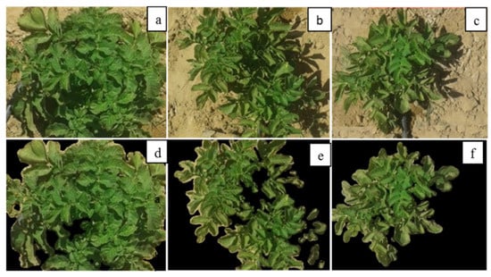 In parallel with measurement of thermal images, the canopy of potato plants within each sub-plot was also photographed between 11:00 and 13:00 h using a 14-megapixel digital camera (Kodak D5100 reflex; Tokyo, Japan) with a resolution of 2454 × 2056 pixels and 8-bit RGB images. The camera was held manually and oriented vertically downward toward the potato plants at a distance of 1 m. In order to minimize illumination discrepancies between images as well as to ensure homogeneous lightning conditions under clear sky conditions, an umbrella was always held above the camera to shade the area under the camera view. The flash of the camera was always kept off during measurements. The digital images were saved in the jpeg format and then analyzed using the Python software (Version 3.7.3). Because the images sometimes contained non-potato crop canopy features, such as soil, weeds, and straw, the images need to be segmented and extracted to eliminate interference by non-canopy information during feature extraction (Figure 2).