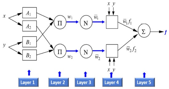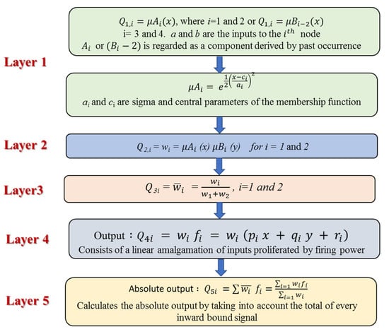where fi is the outputs within the inconsistent zone indicated by the fuzzy principle, Ai and Bi are the membership values, a and b are indirect identifying functions, and pi, qi, and ri are the consequential restrictions that are modified during the forward pass within the learning algorithm. If the membership functions for the fuzzy sets Ai and Bi are μAi and μBi respectively, the five layers that incorporate ANFIS are described in Figure 5. More details about ANFIS can be found in Khadr et al. [].