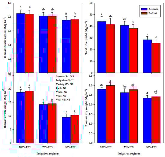 In the present study, the 75% and 50% ETc regimes reduced BFW by 24.0% and 48.0%, BDW by 6.5% and 17.9%, BWC by 4.2% and 10.4%, and TTY by 7.5% and 36.8%, respectively, compared with the 100% ETc regime (Figure 7). Thus, it appears that monitoring the growth and water status of potato plants under deficit irrigation regimes could help growers to make better decisions about irrigation scheduling to manage deficit irrigation and enhance crop productivity, particularly under arid and semiarid conditions and in soil with a low water retention capacity as was used in the present study (sandy loam soil with 69.8% sand). As can be seen, the 75% ETc regime resulted in a similar BDW and BWC of the potato plants and only decreased the TTY by 7.5% compared with the 100% ETc regime, despite there being a 25% saving of irrigation water (Figure 7). However, increasing the deficit irrigation stress by irrigating with 50% ETc significantly reduced all of the measured plant traits in both varieties (Figure 5). This may be because increasing deficit irrigation stress, particularly during sensitive growth stages, significantly reduces the plant water status which, in turn, reduces the elongation and expansion of plant cells and photosynthesis efficiency and induces rapid leaf senescence [,]. All of these negative phenomena eventually result in a significant reduction in dry matter accumulation and final tuber yield.