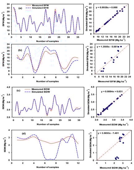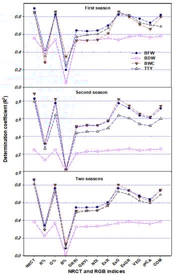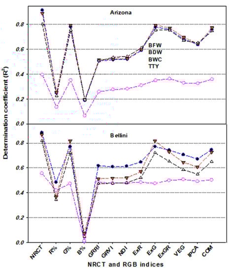 The sensitivities of thermal and RGB imagery indices for estimating plant traits may be affected by several factors, such as the growth stage, growth conditions, plant characteristics, soil background conditions, and irrigation regime, making it difficult to generalize about which is best for a range of conditions–for instance, some indices may be highly sensitive to one plant trait and less sensitive to another. Therefore, in the present study, all of the thermal and RGB imagery indices were included as independent variables in SMLR models to identify which indices explained the most variability in each of the measured plant traits across all conditions (i.e., varieties, irrigation regimes, and seasons). The results showed that NRCT in combination with COM, NRCT together with the R, G, and B band percentages, NRCT alone, and VEG alone explained most of the variation in BFW (89%), BWC (92%), TTY (84%), and BDW (47%), respectively (Table 3). It is also interesting to note that the SMLR models based on the most influential indices showed the best prediction of BFW (R2val = 0.84), BWC (R2val = 0.89), and TTY (R2val = 0.73) but failed to predict BDW (Table 4). This result indicates that SMLR models can also be used to estimate plant traits and that the resulting estimates are better than those obtained from most individual digital camera vegetation indices (see Figure 8, Figure 9 and Figure 10). Furthermore, it is clear that the SMLR models have sufficient predicitivity, particularly for traits related to plant water status and production. This may be because SMLR models are always constructed based on the most influential variables. Similarly, Yue et al. [] also reported that a new comprehensive growth index estimation model, which combined six plant traits (plant height, aboveground biomass, leaf area index, plant water content, plant chlorophyll content, and plant nitrogen content) and was constructed by SMLR, was better than a model based on a single spectral reflectance index (SRI) or a single RGB imagery index. In general, multivariate regression analyses, which include PLSR, SMLR, support vector machine regression (SVMR), ridge regression, random forest, and ANNs, have yielded better prediction models than SRIs for various plant traits in a range of crops and growing conditions [,,,].