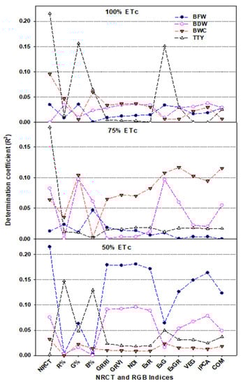 Indices based on RGB bands could also be used to assess plant growth and water status, as well as crop production [,,]. In the present study, the various RGB indices obtained by the digital camera showed significant differences between the three irrigation regimes, with significantly lower values under deficit irrigation (50% ETc) than under full irrigation (100% ETc) (Table 2). In addition, the majority of the RGB indices obtained exhibited a moderate to strong relationship with BFW, CWC, and TTY and a moderate relationship with BDW when the data were analyzed for each season across varieties and irrigation regimes (Figure 9), under all conditions combined (Figure 9), and for each variety across all three irrigation regimes (Figure 8). However, all of the indices failed to exhibit a relationship with any of the plant traits when the data for the two varieties were combined for each irrigation regime (Figure 10). These findings may partly be explained by the different canopy structure, canopy architecture, and leaf angle distribution of the two potato varieties examined, which resulted in different image-derived indices being calculated. However, these differences did not result in any differences in the response of these varieties to the different irrigation regimes in terms of growth or water content, which may explain why there were strong relationships between the measured plant traits and most of the RGB imagery indices for both varieties and across the entire dataset, whereas no such relationships existed for each irrigation regime.