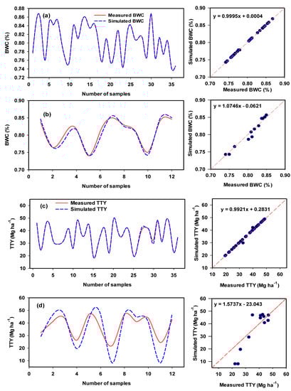 Extraction of the most influential thermal and RGB imaging indices that accounted for most of the variation in the measured traits (BFW, BDW, BWC, and TTY) using SMLR analysis was based on 75% of the datasets (n = 36). The best-fitting calibration equations for the distinct models with the lowest root mean square error (RMSE) values and highest coefficients of determination (R2) were then used to predict each measured trait based on the remaining 25% of datasets.