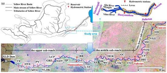 The 5464 km long Yellow River originates from the Bayankala Mountains and flows from west to east through nine administrative regions, and finally extends eastward to the Bohai Sea [33,34,35], which covers three climatic zones including arid region, semi-arid region and temperate monsoon region. Before emptying into the Bohai Sea in Shandong Province, the 786-km long Lower Yellow River flows from Mengjin (abbreviated to MJ) in Henan Province of central China to the northeast across the North China Plain, with a basin area of only 23,000 km2 accounting for a mere 3% of the total area (Figure 1a). The total drop in elevation of the LYR is 93.6 m, with an average channel slope of 0.012%. The LYR receives water and sediment from the mainstream of the Middle Yellow River and two tributaries of the Yiluo River and the Qin River. Excessive sediment deposition in the LYR caused the riverbed level in Kaifeng, Henan Province to be 10 m higher than the level around the surrounding zone. There are three distinct reaches in the LYR according to their different geomorphological characteristics, including a braided reach from Mengjin to Gaocun, a transitional reach from Gaocun to Taochengpu and a meandering reach from Taochengpu to Lijin in proper sequence. There is a narrow main-channel zone with the width ranging between 0.5 and 4.5 km in the LYR, with the area of main-channel zone accounting for about 20% of the total channel area; however, the widths of two floodplains on both sides vary from 5 to 20 km. The braided reach is relatively straight, with the average curvature coefficient of 1.15 and the planform geometry characterised by alternated wide and narrow sub-reaches, with rapid morphological changes often occurring in this reach. Three hydrometric stations have been set up in the braided reach, including Huayuankou, Jiahetan and Gaocun, which can be, respectively, abbreviated to HYK, JHT and GC. Based on the difference in geographical positions and boundary conditions, the braided reach is commonly divided into three sub-reaches, including the upper sub-reach from MJ to HYK, the middle sub-reach from HYK to JHT, and the lower sub-reach from JHT to GC (Figure 1b). In general, the braided reach is characterised by a wide and shallow cross-sectional geometry, a frequently shifting main-channel, and a rapid changing channel planform [19,33].
