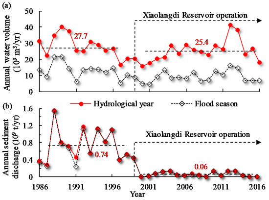 Variation in the condition of flow and sediment at HYK: (a) water volume; (b) sediment discharge.