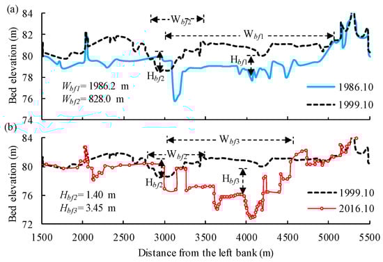 Owing to the fact that remote sensing images cannot quantify the accurate banklines at bankfull level, 28 post-flood profiles of sedimentation cross-sections in 1986–2016 were adopted to calculate the section-scale bankfull channel widths. Xia et al. [10,11] proposed a suitable identification method to determine the bankfull channel widths at such sections with complex geometry. Furthermore, an integrated approach was utilized in this study to determine the reach-scale bankfull channel width (), which combines the geometric average based on the log transformation and the weighted mean based on the distance between two consecutive sections [10]. The specific representation of is written in this form: