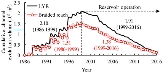 The braided reach in the LYR underwent two contrasting stages of bed deposition and erosion in 1986–2016, leading to significant variations in lateral shifting of bankline, thalweg, main streamline and channel centerline. The continuous process of channel aggradation in 1986–1999 was caused by the unfavourable matching relationship between water discharge and the corresponding sediment concentration, and the cumulative volume of sediment deposition was 1.51 × 109 m3 during this period, which comprised 71.9% of the total value in the LYR (Figure 4). However, significant channel degradation occurred in this reach after the onset of the reservoir in 1999, with the cumulative channel scour volume of 1.38 × 109 m3 comprising 72.2% of the total value in the LYR. The flood-season cumulative volume of channel scour was 0.65 × 109 m3, which was approximately equivalent to the value of 0.72 × 109 m3 in non-flood seasons. Since the degree of channel deformation in flood seasons was of equal importance as that in non-flood seasons, the hydrological-year average parameters of flow and sediment over the period 1986–2016 were used in the following analysis.