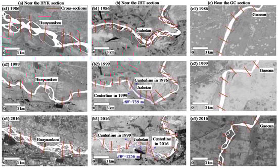 Remote sensing images are characterized by real-time, accurate, and intuitive information, which are often used to recognize land-water boundaries to depict the process of channel migration [21]. Combined with the GIS technique, remote sensing images in different periods can be compared, with the characteristics of channel migration being determined for a long time series, which can greatly improve the calculation accuracy of channel migration. Therefore, Thematic Mapper (TM), Enhanced Thematic Mapper (ETM+) and Operational Land Imager (OLI) Landsat scenes with a spatial resolution of 30 m over the period from 1986 to 2016 were collected in this study. Figure 5 shows the local satellite images near the sections of HYK, JHT and GC at different times. These satellite images are archived by the EROS Center of USGS (https://glovis.usgs.gov/) (accessed on 20 June 2020).