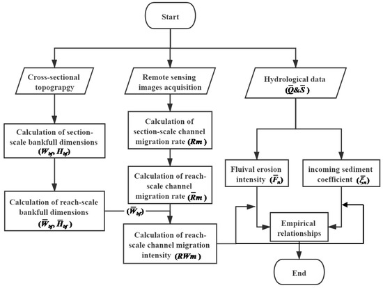 A detailed calculation procedure is proposed herein to quantify migration rates and intensities of channel centerline at section- and reach-scales, using a fusion approach of data from multiple sources at various scales, obtained from the measurements of hydrological data, cross-sectional topography and remote sensing images. This proposed procedure is illustrated in Figure 6, which covers the calculations of characteristic parameters representing the flow-sediment condition, bankfull channel dimensions (width and depth) at reach-scale, section-scale channel migration rate, and reach-scale channel migration rate and intensity.