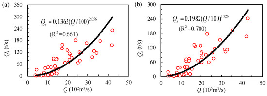 It is known to us that sediment transport is mainly composed of suspended load instead of bed load in an alluvial river such as the LYR. The relationship between sediment discharge (Qs) and water discharge (Q) has been developed in previous studies. Such a relation is usually defined as sediment rating curve (SRC). It commonly takes the form of a power function, and the general relationship between them is expressed by Qs = aQb [38,39,40,41,42,43]. Syvitski et al. [39] have stated that the SRC is the statistical relationship between suspended sediment discharge and water discharge and, therefore, the SRC is not only for sediment that does not participate in morphological processes. Previous studies also regarded the parameter a as an index of erosion severity in a river channel [44,45], and the exponent b is used to depict the erosion power of a river, both of which reveal that the SRC is related to morphological processes.
