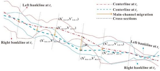 Section-scale bankfull discharges vary significantly along the braided reach owing to the difference in cross-sectional geometry [10,11], and it is difficult to identify accurately the river bankline and the main-channel zone at bankfull level from a specified satellite image. Therefore, channel migration can usually be represented by the migration of channel centerline, which can be determined from the channels at low water levels extracted from the post-flood satellite images.