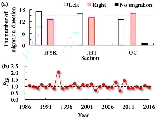 Migration directions at the typical sections of HYK, JHT and GC were determined during the period 1986–2016. The total numbers of leftward migration at three sections were 17, 16, and 13, respectively, while the numbers of rightward migration were 13, 14, and 16 (Figure 9a). These results indicate that the probability of the channel centerline migrating toward the left bank was approximately equal to the probability of rightward migration from a long-term sequence.