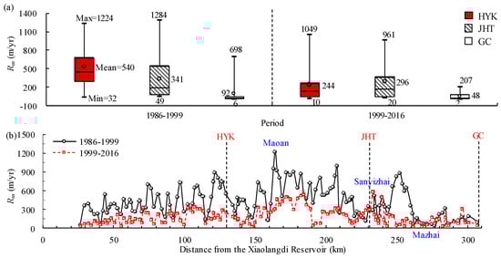 Temporal variations in the section-scale migration rate of channel centerline: (a) at sections of HYK, JHT and GC; (b) at all the sections in the braided reach.