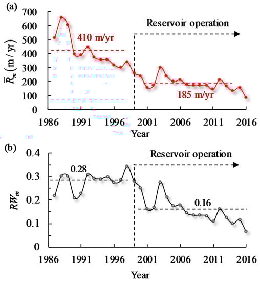 Subsequently, the reach-scale migration rates of channel centerline in the braided reach from 1986 to 2016 were calculated using Equation (6), as shown in Figure 11a. During the continuous channel aggradation period 1986–1999, the largest reach-scale channel migration rate was 659 m/yr, which occurred in 1988 mainly due to the occurrence of a hyperconcentrated flood event, and the average annual channel migration rate was 410 m/yr in 1986–1999. After the reservoir operation, the maximum reach-scale migration rate (303 m/yr) occurred in 2003, and it was mainly related to strong flood processes. Five flood events with low sediment concentrations and large water discharges occurred in the 2003 flood season, which caused intensive scour and migration processes. The average annual migration rate at reach-scale was 185 m/yr in 1999–2016, with a reduction of 55%, as compared with the pre-dam value in 1986–1999.