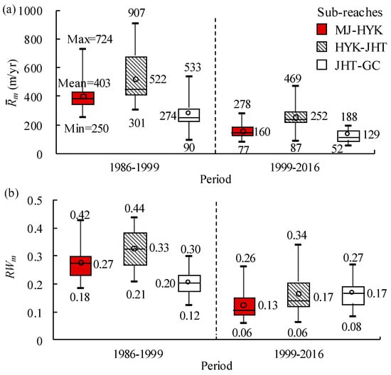 In addition, the average annual channel migration intensities in 1986–1999 were, respectively, 0.27, 0.33 and 0.20 m/(yr·m) in the sub-reaches of MJ–HYK, HYK–JHT, and JHT–GC, as shown in Figure 12b. In 1999–2016, the average annual migration intensities in three sub-reaches were reduced, respectively, to 0.13, 0.17 and 0.17 m/(yr·m), with the corresponding reduction degrees of 52%, 48% and 15%. The JHT–GC sub-reach had the smallest channel migration rate, but the mean migration intensity was relatively large, because the bankfull channel width in this sub-reach was only half of the other two sub-reaches, resulting in a higher channel migration intensity.