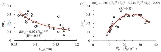 In addition, geomorphic coefficient () was used to represent the cross-sectional geometry [10]. A polynomial function relationship can be established between RWm and geomorphic coefficient (), as shown in Figure 13b. The migration intensity of channel centerline first generally increased with the increasing geomorphic coefficient, whereas it reached the maximum value when the magnitude of geomorphic coefficient was equal to about 25 m−0.5, and then it decreased with the increasing geomorphic coefficient, with R2 = 0.83. It can be seen that the migration degree was stronger in a wider and shallower channel geometry when geomorphic coefficient ranged within a certain limitation; however, the channel showed a narrower and deeper geometry owing to the recent channel degradation in 1999–2016, which decreased the migration degree of channel centerline.
