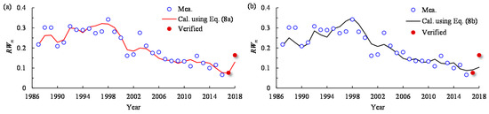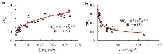 It indicates that: the value of RWm increased with a larger previous two-year mean incoming sediment coefficient (), with R2 = 0.90 (Figure 14a), and decreased as the previous two-year mean fluvial erosion intensity () increased, with R2 = 0.85 (Figure 14b). It comes to a conclusion from Figure 14 that the incoming sediment coefficient or fluvial erosion intensity is an important factor that remarkably influenced the migration intensity of channel centerline in the braided reach over the period 1986–2016.