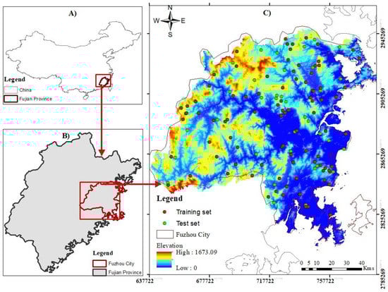 The study area map: (A) Fujian Province, China; (B) Fuzhou city; (C) sample points.