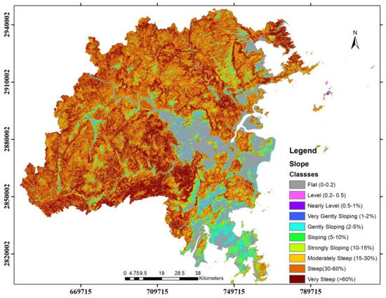 A 10 m resolution digital elevation model (DEM) was obtained from the Fuzhou city surveying department. The aerial images for DEM generation were acquired using combined digital camera (i.e., Canon EOS M) systems with resolutions of 18 MP and a 22.3/14.9 CMOS image sensor mounted on UAVs. The flight was planned on sunny days where there was low cloud cover, and the online maps were used for flight planning purpose. The UAV captured photos on the basis of the plan within 2 s intervals so as to remove blurred photos. Then, the DEM was generated using photogrammetric techniques while the ground control points (GCPs) were used for verification. The high-resolution DEM data were used to extract landform, hydrological, and spatial indices Moreover, the topography was classified using the approaches described in FAO guidelines for soil description [46] (Figure 2).