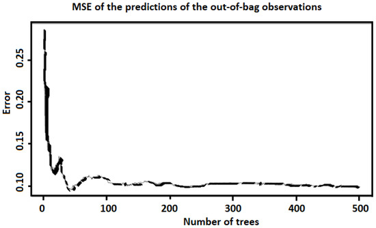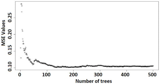 The ntree parameter (the number of trees in the forest) was adjusted using the mean squared error (MSE values) as a measure of the prediction accuracy of the RF model (Figure 7).