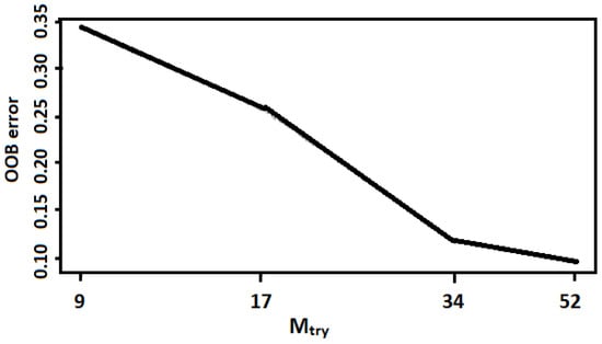 The ME of the training set varied from 0.05 mg·g−1 to 0.06 mg·g−1 with a mean value of 0.04 mg·g−1, while the RMSE values ranged from 1.35 mg·g−1 to 1.38 mg·g−1 with a mean value of 1.37 mg·g−1. The ME of the test set varied from 0.3 mg·g−1 to 0.43 mg·g−1 with a mean value of 0.4 mg·g−1, while the RMSE values ranged from 0.94 mg·g−1 to 0.97 mg·g−1 with a mean value of 0.96 mg·g−1. In addition, the tuned random forest model applied to select optimum number of mtry and number of trees was verified. Accordingly, the out-of-bag (OOB) errors were 0.44, 0.22, 0.11, and 0.09 for mtry values of 9, 17, 34, and 52, respectively, implying that the use of more predictor variables led to a lower OOB error (Figure 9) and better accuracy for prediction of SOC in the study area.